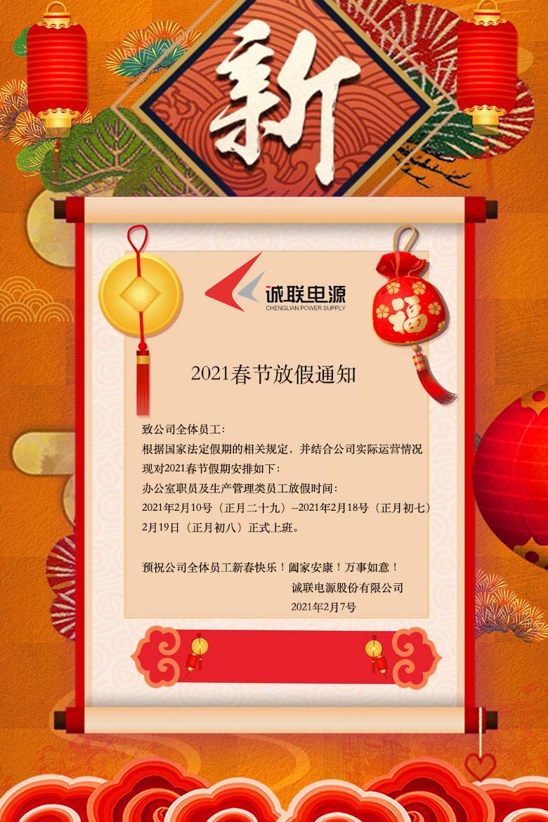 今天是鼠年的倒數幾天,馬上我們將迎來嶄新的牛年,值此新春佳節到來之際,誠聯電源在此向各位領導、各個板塊支持我們的客戶朋友們、社會各界關心支持我們的朋友們以及全體員工及家人們,表達誠摯的祝福,祝你們在新的一年里新春快樂身體健康闔家幸福萬事如意福星高照喜上眉梢歡天喜地吉祥如意財運亨通五谷豐登
